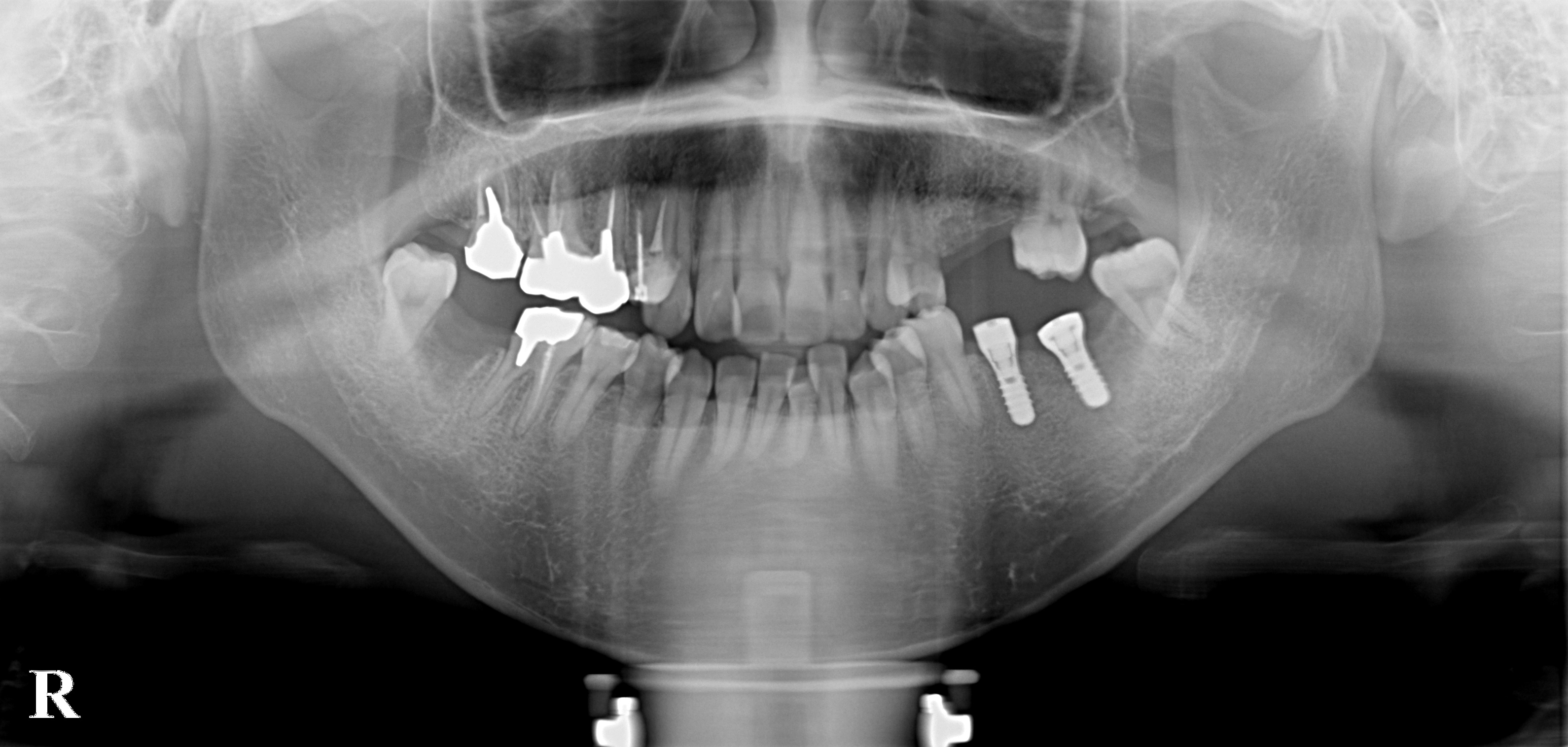 本日は、20代女性の方の奥歯のインプラントを行いました。奥歯がないために食べるのに非常に時間がかかるということでした。CTレントゲンでも骨が十分にありましたので、一番奥のインプラントは、体積が大きいワイドネックのインプラントを使用しました。ほぼ、理想的な場所に入っています。